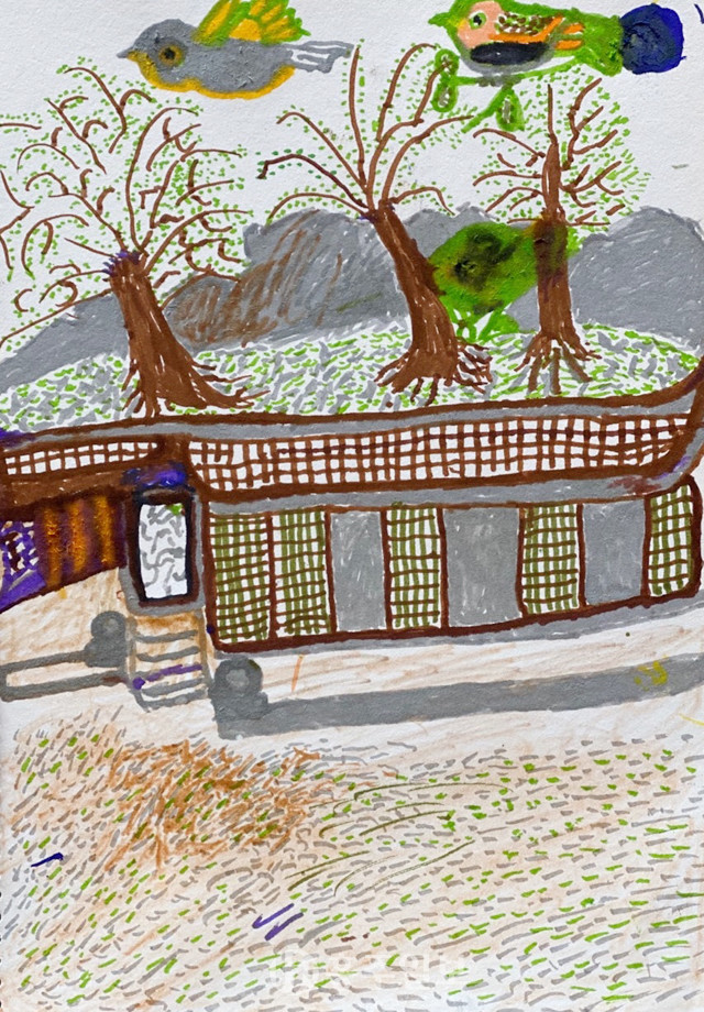 이연복 할머니의 〈우리 집〉 그림은 색조가 차분하다. 보는 사람을 편안하게 해 준다. 펜이 지나간 자국도 조용조용하다. 한 땀 한 땀 바늘땀을 이어가듯 펜으로 점을 찍고 자국을 내셨다.