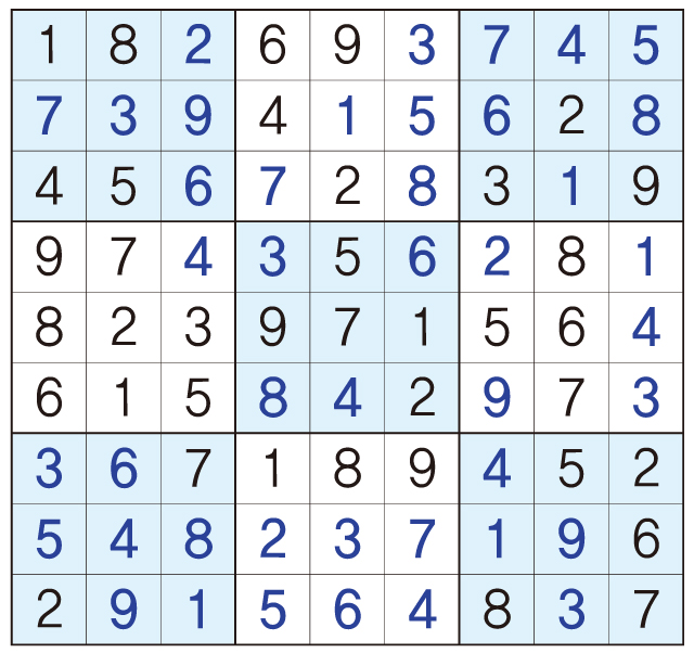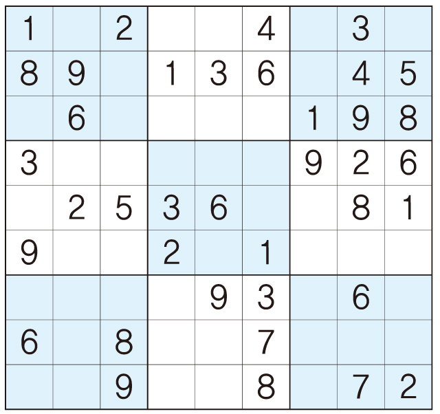 3. 큰 정사각형(9x9) 안에 있는 작은 정사각형(3x3) 안에는 숫자 1~9가 각 한 번씩 들어간다.