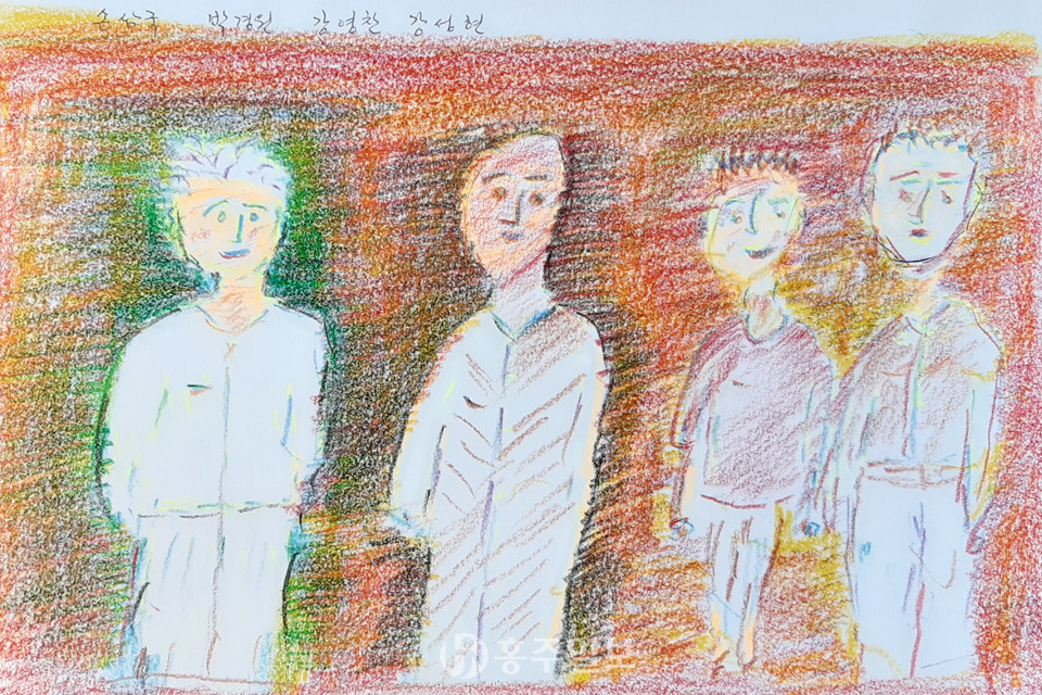 박용준 할아버지는 또 인물에 색을 칠하지 않고 바탕에 색을 칠해 인물이 드러나도록 하였습니다. 대개는 인물부터, 중심부터 색을 칠하기 시작하는데 박용준 할아버지는 바깥부터 칠하여 가운데의 사람을 남겨 두셨습니다. 그런데 그 효과가 남다릅니다. 사람을 칠하지 않고 남겨두므로 할아버지가 어눌하게 그린 선이 더 잘 보이고 살아서 부드러운 느낌을 전달해주고 있습니다. 인물 밖에 칠한 색채가 주홍빛이어서 마치 태양빛 또는 불빛을 받으며 사람들이 서 있는 것 같기도 하고 인물에서 광채가 퍼져 나오는 것 같기도 합니다.