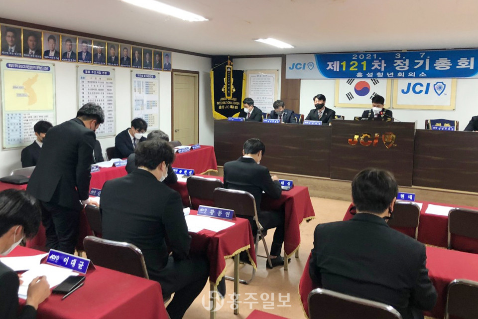 홍성청년회의소(회장 이상덕)는 지난 7일 회의소 대회의실에서 회원 30여 명이 함께한 가운데 ‘제121차 정기총회 및 신입회원 선서식’을 실시했다. 코로나19로 인해 2개월가량 미뤄진 이번 정기총회에서 이상덕 신임회장이 첫 의사봉을 잡았으며, 이어진 신입회원 선서식을 통해 김덕호·신현대 신입회원이 가입했다.