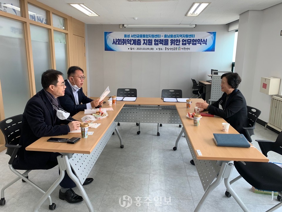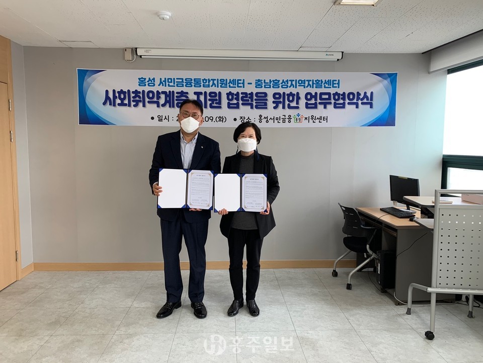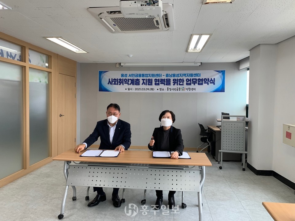 충남홍성지역자활센터(센터장 윤명희, 이하 자활센터)와 홍성서민금융통합지원센터(센터장 황재호, 이하 서금원)는 지난 9일 홍성서민금융통합지원센터 회의실에서 업무협력 협약을 체결했다.