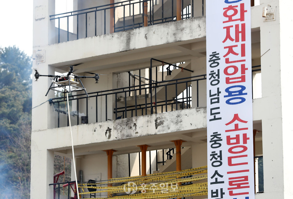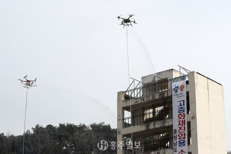 충청소방학교(학교장 방장원)가 호서대학교 김홍 교수 팀과 함께 ‘고층 화재 진압 소방드론 시스템 구축’을 추진, 가시적인 성과를 거두며 실현 가능성을 확인했다. 충청소방학교는 지난 11일 양승조 지사와 외부 전문가 등이 참석한 가운데 고층 화재 진압용 소방드론 시스템 시연회를 개최했다.