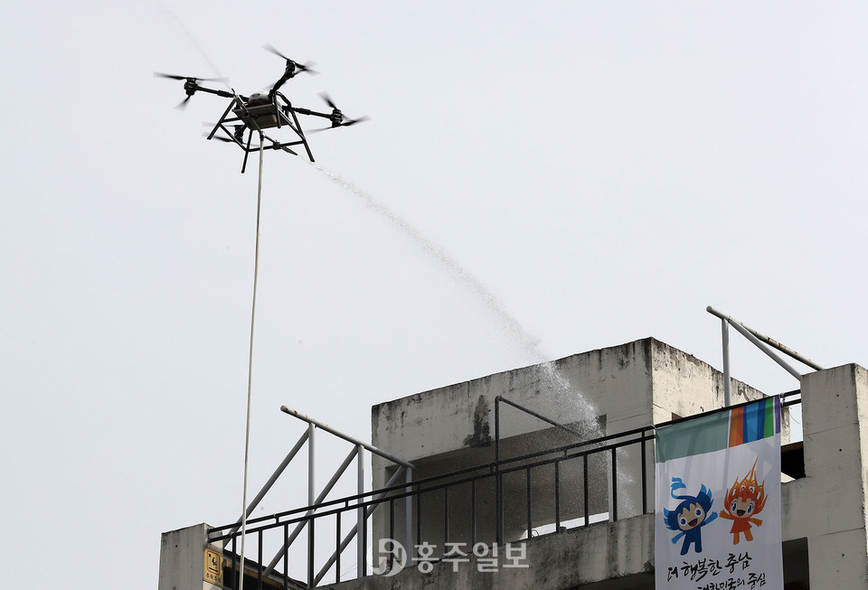 실증훈련에 투입한 소방드론은 15m 상공에서 10㎏/㎠의 압력으로 20m 안팎의 물줄기를 5분가량 내뿜었다.