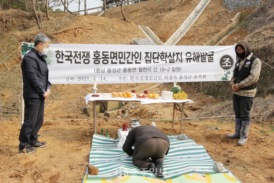 한국전쟁민간인희생자 홍성군유족회(회장 이종민)는 지난 13일 홍동면 월현리 산 18-2 일원 시굴에 앞서 개토제를 지냈다. 유해 찾기를 간절히 바라는 유족들과 함께 정석희 한국전쟁민간인희생자 충청남도유족회장이 절을 올리고 있다.