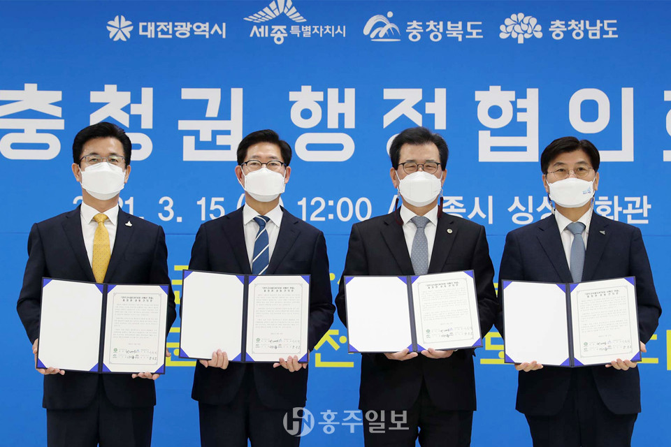 충남도와 대전시, 세종시, 충북도 등 충청권 4개 시·도가 ‘서해선 서울 직결’에 힘을 모으기로 했다. 충청권 4개 시·도지사는 지난 15일 세종시 싱싱문화관에서 ‘제30회 충청권 행정협의회(회장 허태정 대전시장)’를 열고 ‘경부고속철도와 서해선 연결 공동건의문’에 서명했다.<사진>