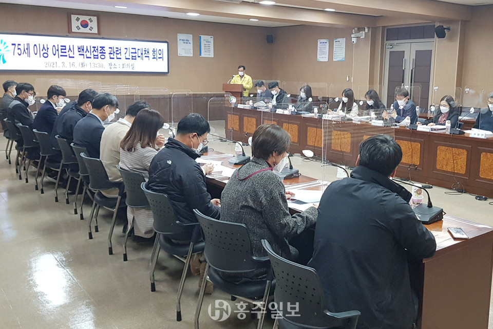 홍성군은 지난 16일 군청 회의실에서 ‘75세 이상 어르신 대상’ 코로나19 백신 접종 관계자 긴급 대책 회의를 개최했다.<사진>