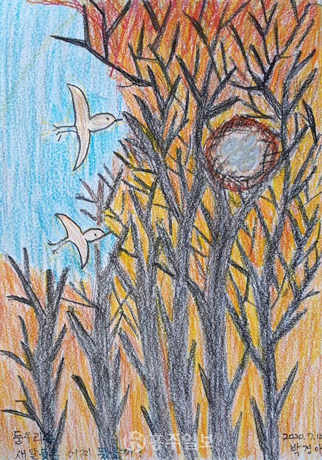 회화는 그림을 말합니다. 시의 여러 구절 중에 특히 ‘둥우리 속 새알들은 어찌 되었을까?’에 그림을 그린 이의 마음이 닿은 것 같습니다. 산불이 났을 때 둥우리 속의 새알들은 어미 새가 꺼내 주지 않으면 꼼짝없이 타 죽고 말게 됩니다. 시인의 천진한 동심이 느껴지는 구절입니다.