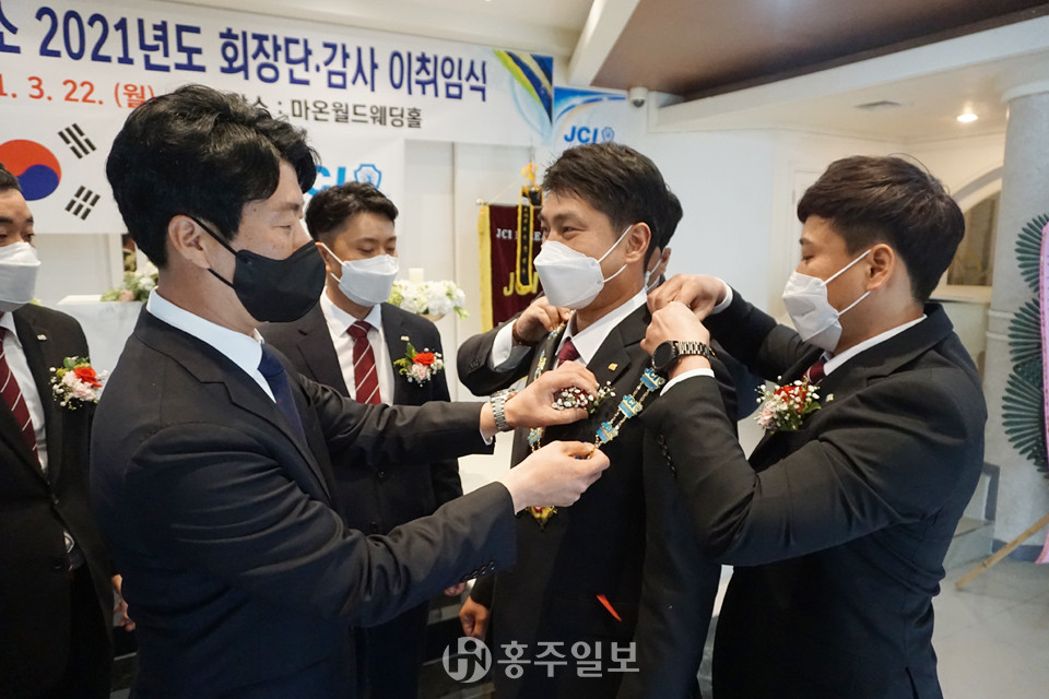 홍성청년회의소(이임회장 전성수·취임회장 이상덕)는 지난 22일 마온월드웨딩 크리스탈홀에서 ‘홍성청년회의소 2021년도 회장단, 감사 이·취임식’을 개최했다.