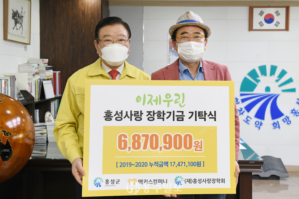 (주)맥키스컴퍼니(회장 조웅래)는 지난 19일 군수실에서 (재)홍성사랑장학회(이사장 김석환)에 장학금 687만 원을 기탁했다. ㈜맥키스컴퍼니는 10년간 홍성지역의 일반음식점에서 판매되는 ‘이제우린’ 1병당 5원을 적립해 장학금을 기탁하고 있다.