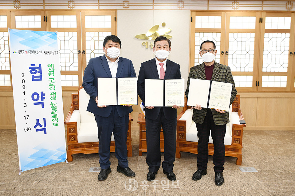 예산군이 올해 역점으로 추진 중인 지역 농·특산물 활용 예산형 구도심재생 뉴딜프로젝트의 성공적인 수행을 위해 ㈜더본코리아, 예산시장상인회와 지난 17일 업무협약을 체결했다.