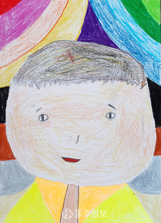 이 그림의 매력은 자유로움입니다. 어떤 것에도 얽매이지 않고 그려나갔습니다. 선도 색도 형태도 어린이 마음 가는 대로 그렸는데 어색하지 않습니다. 인물을 가운데 놓고 양쪽으로 선과 색이 대칭을 이루어 마치 접힌 커튼 앞에 어린이가 앉아 있는 것 같습니다. 턱 밑에 그린 칸에는 얼굴과 같은 색을 칠했고 그 모양이 좁고 길어서 넥타이를 맨 것 같이 보입니다. 양쪽에 면이 삼각형이어서 더더욱 넥타이를 매는 와이셔츠를 입은 것 같습니다.