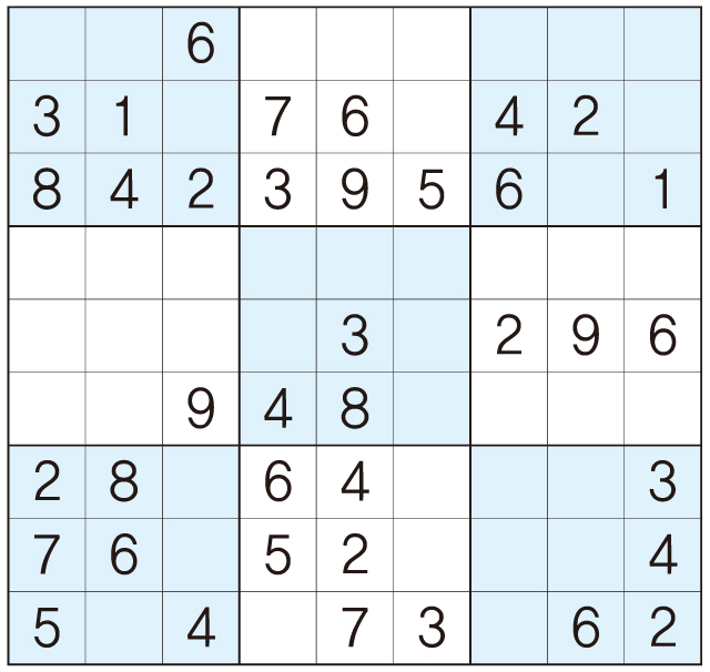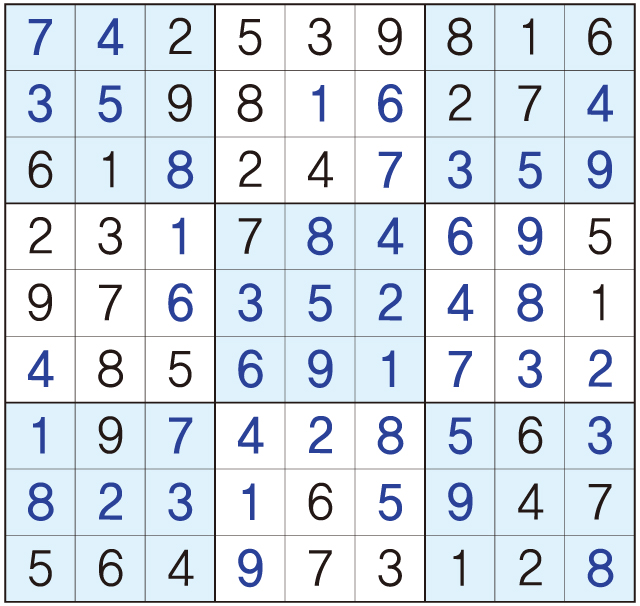 3. 큰 정사각형(9x9) 안에 있는 작은 정사각형(3x3) 안에는 숫자 1~9가 각 한 번씩 들어간다.