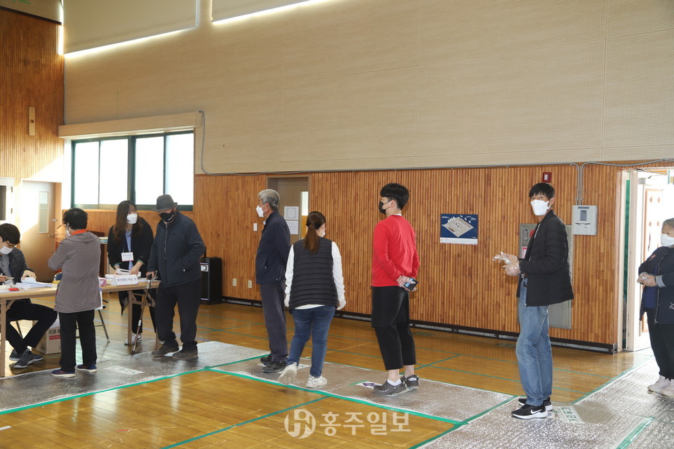 예산군의회의원 재선거는 6시부터 20시까지 진행된다. 덕산1투표소(덕산초등학교)의 유권자들은 일정한 거리를 유지하며 열을 재고 1회용 비닐 장갑을 착용하는 등 코로나19 방역조치를 하고 투표에 참여했다.
