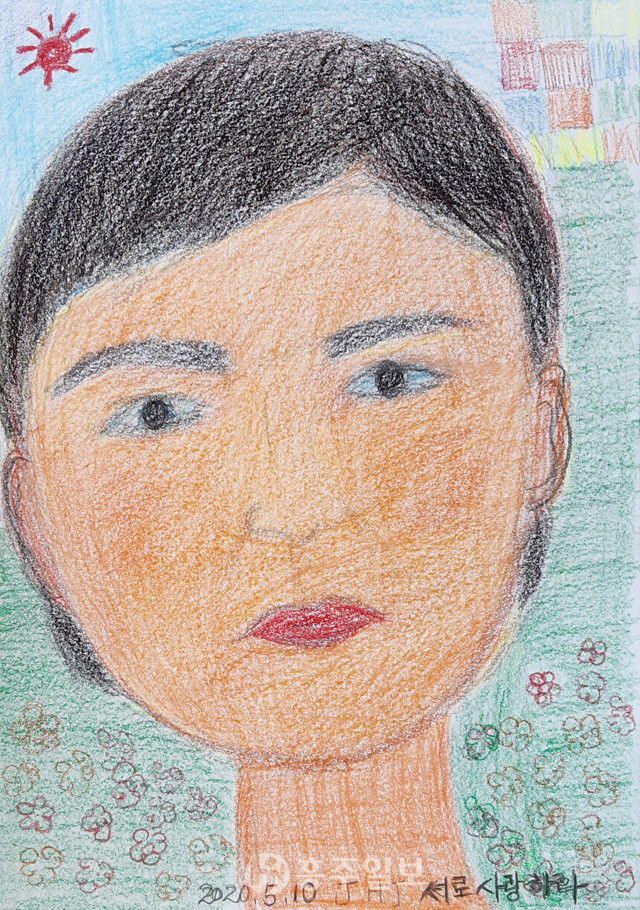 인물 위에는 해가 그려져 있습니다. 작아서 멀리 있는 것 같지만 분명히 빛나고 있습니다. 잘 보이지는 않지만 꽃송이도 잔잔하게 그려 놓았습니다. 맨 아래에는 ‘서로 사랑하라’는 성경 문구도 썼습니다. 모두 그린 사람을 이해하는 요소가 됩니다. 이런 것 또한 자화상의 일부입니다.