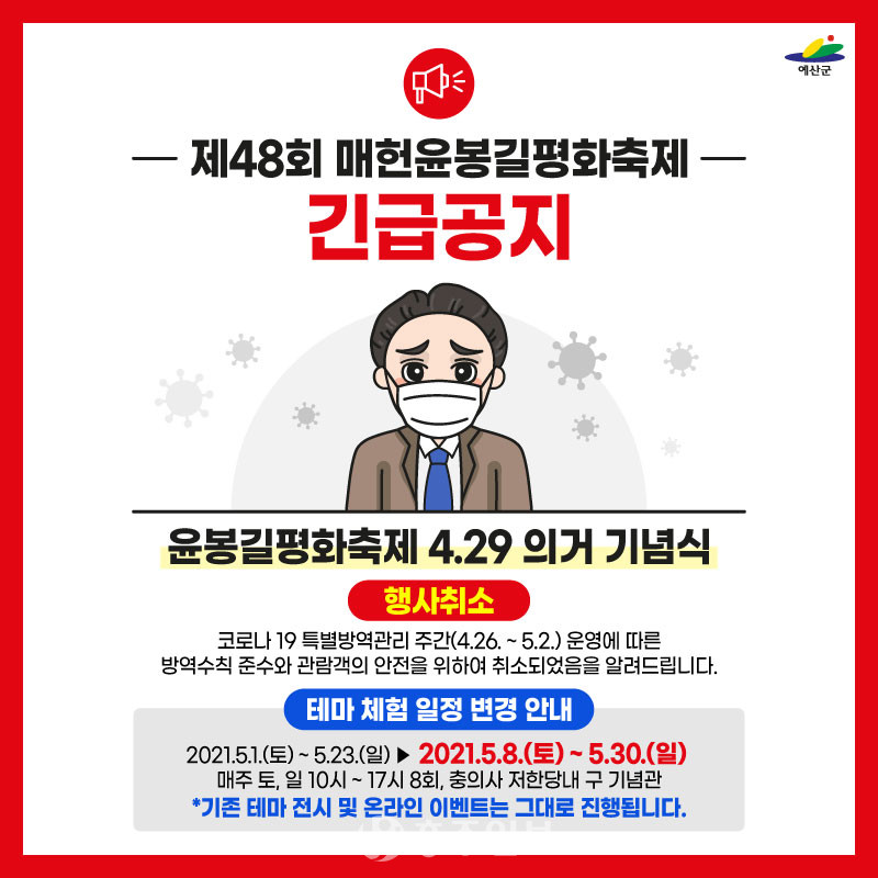 당초 기념식은 군과 (사)매헌윤봉길월진회, 방역기관 등의 의견을 종합적으로 고려해 예년에 비해 참석 규모를 대폭 축소해 개최될 예정이었다. 그러나 최근 코로나 확진자 발생 증가와 정부 코로나19 특별방역관리 주간 운영(4. 26.∼5. 2.)에 따라 군은 지난 26일 긴급 대책회의를 열고 취소를 결정했다.