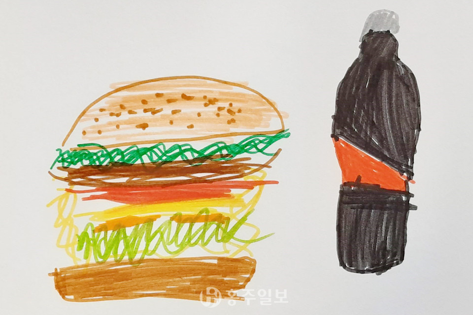 할머니를 따라와 그림을 그리는 손자는 초등학교 1학년입니다. 그림을 쓱쓱 잘도 그리는 손자의 스케치북을 넘겨보다가 발견한 그림이 바로 〈햄버거〉입니다. 그림 위에 그린 날짜와 이름 그림 제목이 쓰여 있습니다. 바탕색 없이 햄버거와 콜라병만 간결하게 그렸는데 매력이 있습니다. 대상을 정확히 파악하고 기억해 빠르게 그렸습니다. 과감하게 생략한 부분도 있고 세밀하게 묘사한 부분도 있습니다. 콜라병 뚜껑, 햄버거 빵의 위아래, 양상추와 치즈 뭐 하나 색채가 같은 게 없습니다. 다르면서도 잘 어울리게 골라 쓴 색채 감각이 돋보입니다. 마치 기성 작가의 속도감 있는 스케치를 보는 것 같습니다. 그러나 마무리가 조금 덜 된 아쉬움도 있습니다.