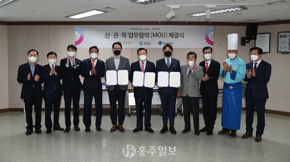 홍성군은 30일 청운대학교, 롯데백화점(잠실점)과 함께 ‘산·관·학 상생발전을 위한 업무협약(MOU)’을 체결했다.<사진>