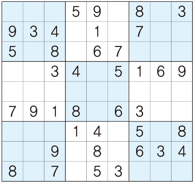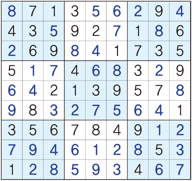 3. 큰 정사각형(9x9) 안에 있는 작은 정사각형(3x3) 안에는 숫자 1~9가 각 한 번씩 들어간다.