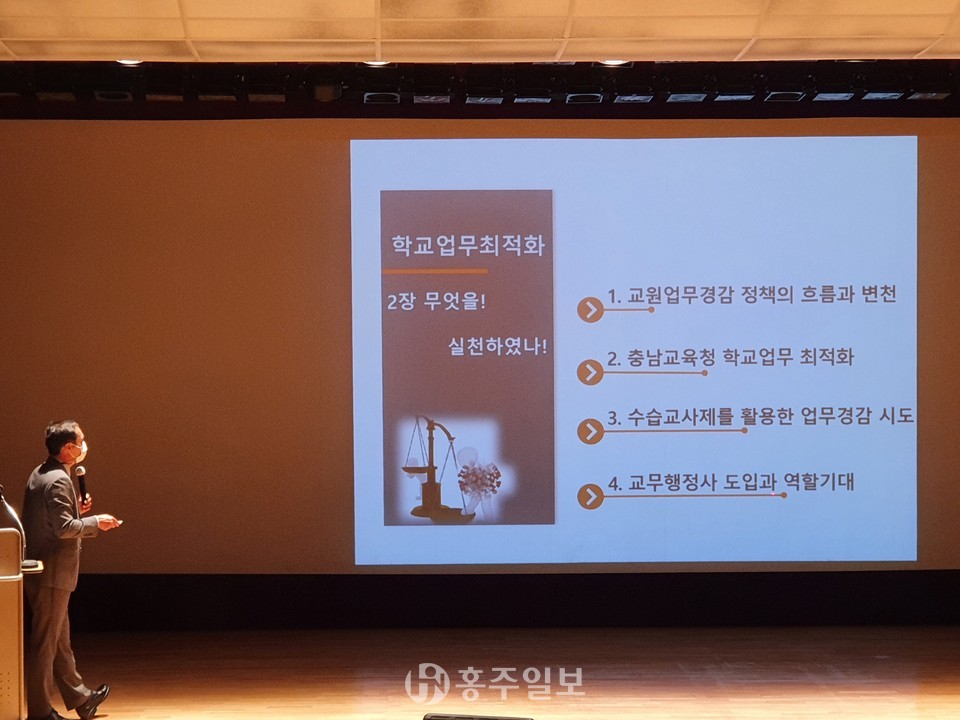 이날 연수는 청양 가남초 김태길 교장이 발표자로 나서 교원의 행정업무경감 정책 실천 상황을 듣고 단위학교에서 학교업무최적화를 위해 시도할 만한 방법에 대해 함께 고민하는 시간을 가지는 순서로 진행했다.