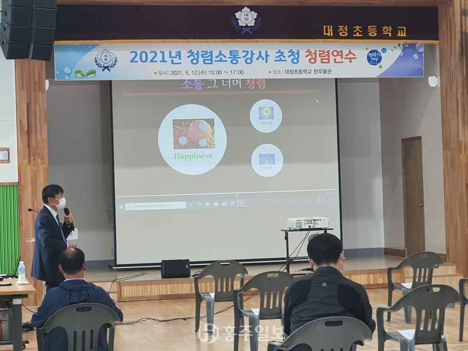 대정초등학교(교장 최영란)는 12일 대정초 한우물관에서 청렴소통강사 주진익 과장(홍성교육지원청 교육과장)을 초청해 전직원을 대상으로 ‘소통 그 너머 청렴’이란 주제로 청렴연수를 실시했다.<사진>