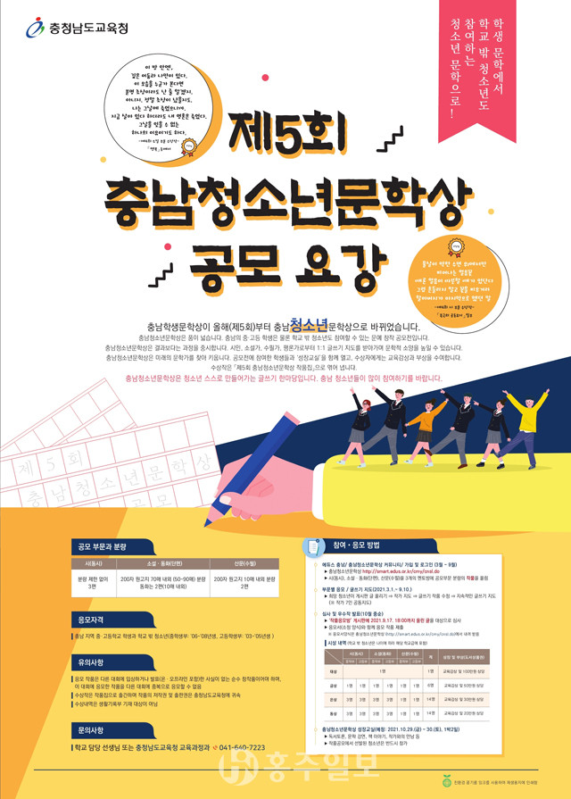 충남교육청(교육감 김지철)은 지난 2017년부터 운영한 충남학생문학상을 올해부터 ‘충남청소년문학상’으로 바꿔 운영한다. 학생이 아니더라도 충남의 청소년이라면 누구나 참여할 수 있도록 품을 넓힌 것이다.
