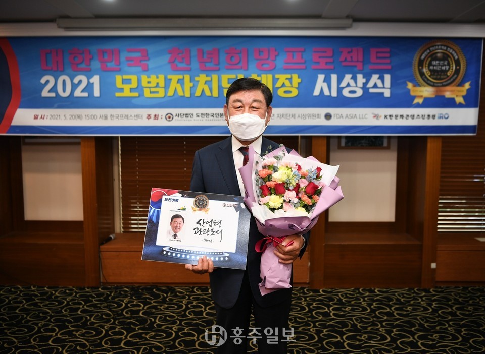 황선봉 예산군수가 지난 20일 한국프레스센터에서 열린 ‘대한민국 천년희망 프로젝트 제4회 모범 자치단체장 시상식’에서 ‘행정 리더십 분야’ 대상 수상의 쾌거를 거뒀다.<사진>