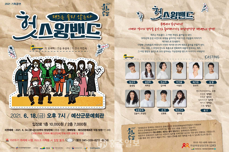 예산군문예회관은 오는 6월 18일 오후 7시 문예회관 공연장에서 뮤지컬 ‘헛스윙밴드-재즈는 울지 않는다’를 공연한다.