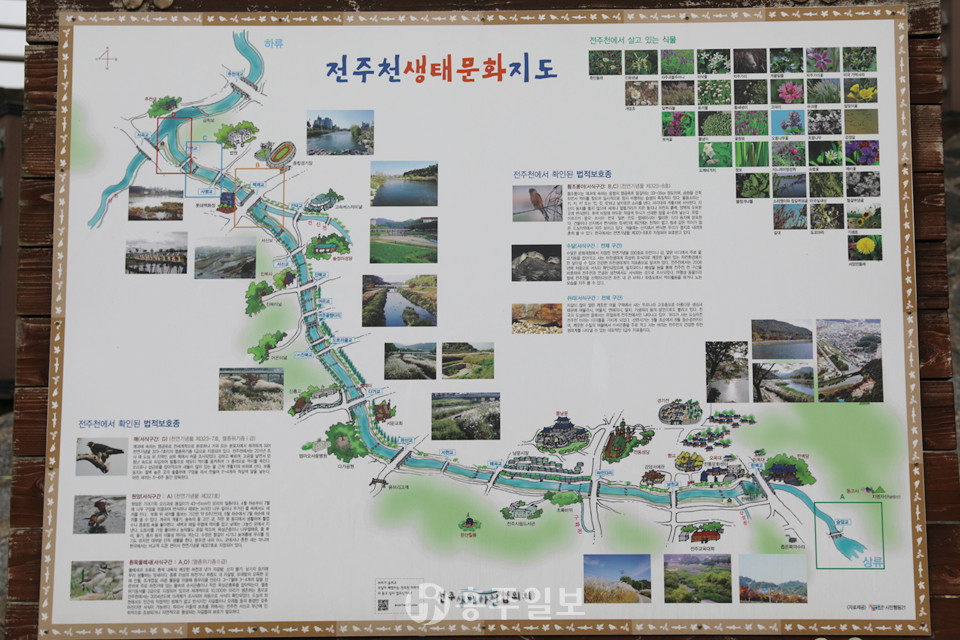 특히 전주천 상류에는 천연기념물 수달과 원앙이 살고 있을 정도로 깨끗한 수질과 환경을 자랑하고 있으며, 늦가을이 되면 전주천 둔지에 피어나는 물 억새가 장관을 이루는 전주의 명소이기도 하다. 전주천 자연형 생태하천복원사업은 환경부 자연형 하천정화 우수 사례로 뽑혔을 뿐만 아니라, 생태계를 성공적으로 복원시킨 모델로 인정받기도 했다. 또 전주천은 전주의 역사와 함께 다양한 이야기가 전해지고 있다. 전주팔경 중 으뜸이라는 기린토월과 한벽청연, 남고모종, 다가사후 등의 이야기가 전주천을 따라 흐르고 있다. 조선 태조 이성계와 정몽주, 초록바위에 얽힌 김개남 장군과 천주교의 이야기가 들려온다.