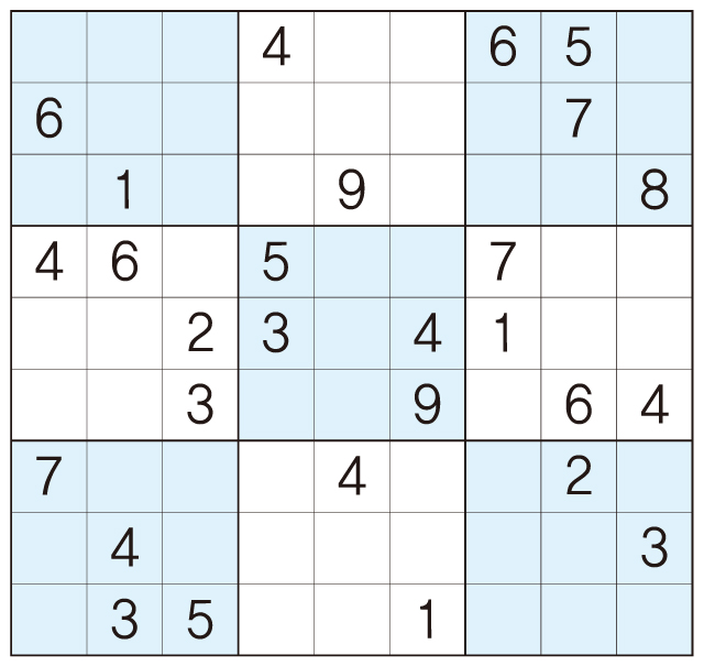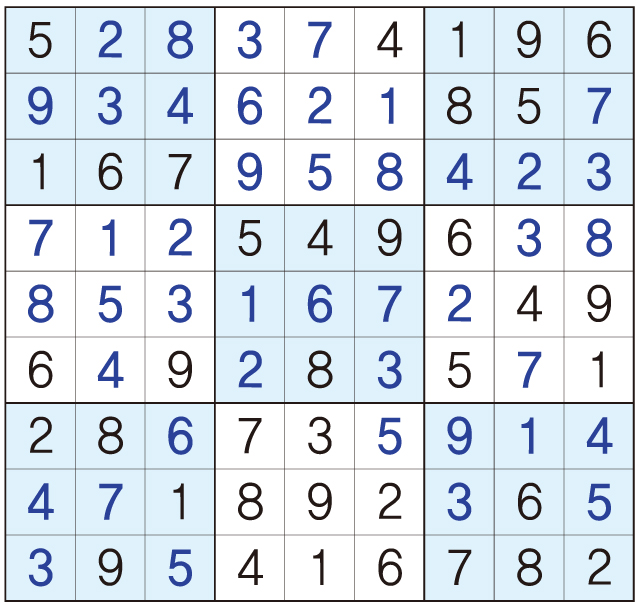 3. 큰 정사각형(9x9) 안에 있는 작은 정사각형(3x3) 안에는 숫자 1~9가 각 한 번씩 들어간다.