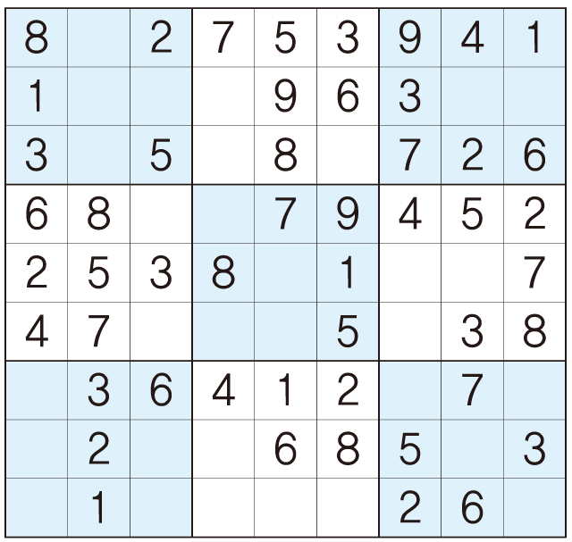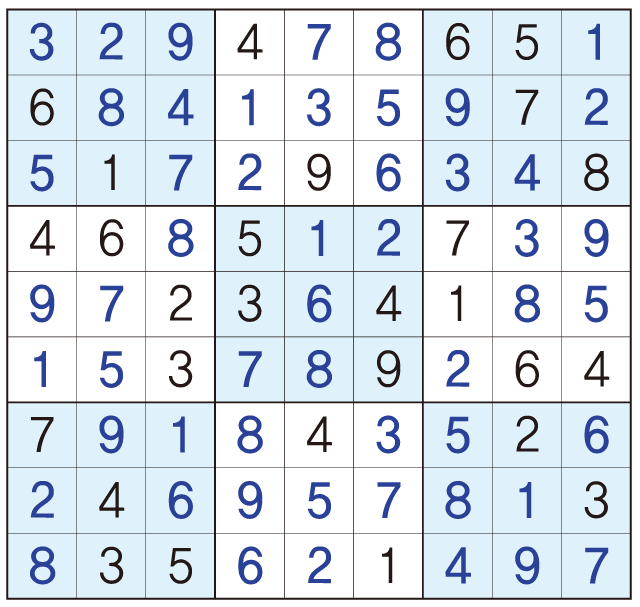 3. 큰 정사각형(9x9) 안에 있는 작은 정사각형(3x3) 안에는 숫자 1~9가 각 한 번씩 들어간다.