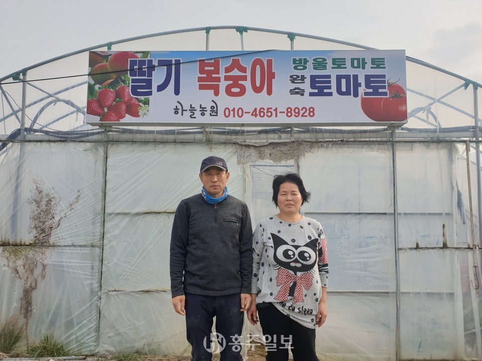 최양현·손금옥 부부는 25년 영농경력을 바탕으로 하늘농원을 운영하며 딸기와 복숭아를 재배하고 있다. 1997년 농사를 시작한 이후 세종시 금남면 도암리에서 시설하우스 딸기와 호박, 복숭아, 감자 농사에 전념하고 있다.