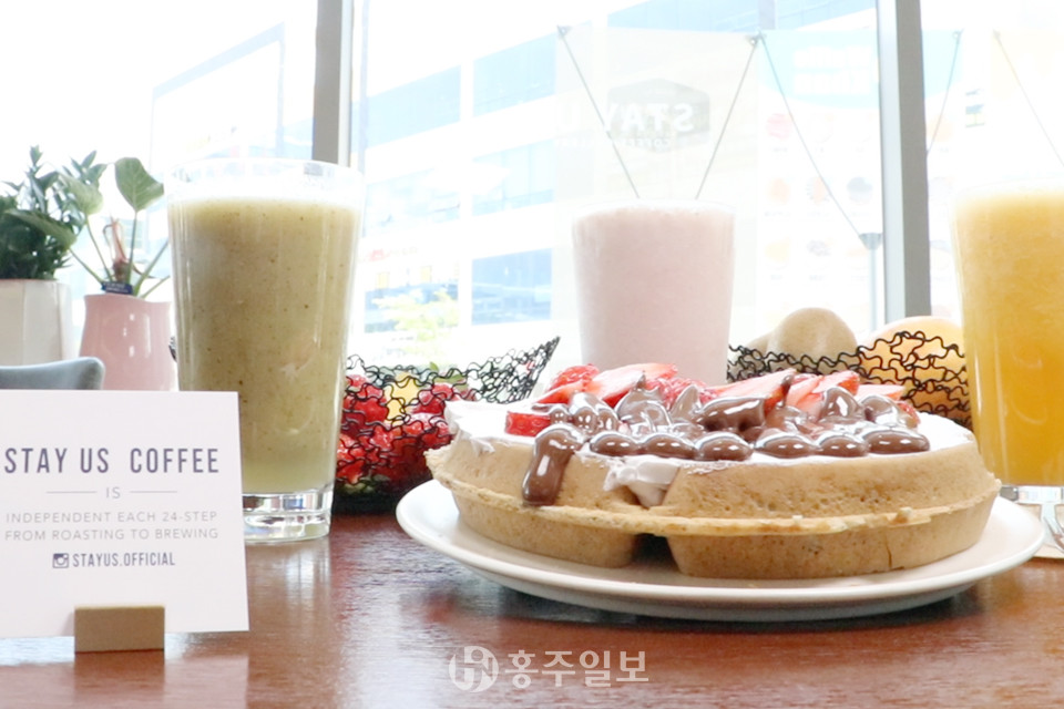 ‘스테이 어스’에는 커피와 함께 곁들일 수 있는 다양한 와플과 크로플을 함께 판매하고 있다. 지난해 2월부터 샵인샵 방식으로 ‘와플칸’이라는 프랜차이즈를 통해 와플을 생산, 판매하고 있는데 매일 아침마다 반죽을 새로 해서 바로바로 굽는 시스템이다. 와플은 구워서 15분 정도 식는 시간을 두는데 식는 것이 싫은 고객들에겐 그 취향까지 고려해 세심하게 대접하고 있다.비교적 부담스럽지 않은 가격으로 다양한 맛의 와플을 맛볼 수 있는 곳이다. 최근까지는 ‘누델라딸기’가 제일 인기가 많았고 계절마다 제철 과일을 이용한 메뉴들을 선보일 예정이다. 취향에 따라 색다른 와플을 골라서 즐길 수도 있다. 아울러 고객들의 건강을 고려해 매장에서는 시판되는 시럽 대신 다양한 청을 직접 담가서 사용하고 있다.