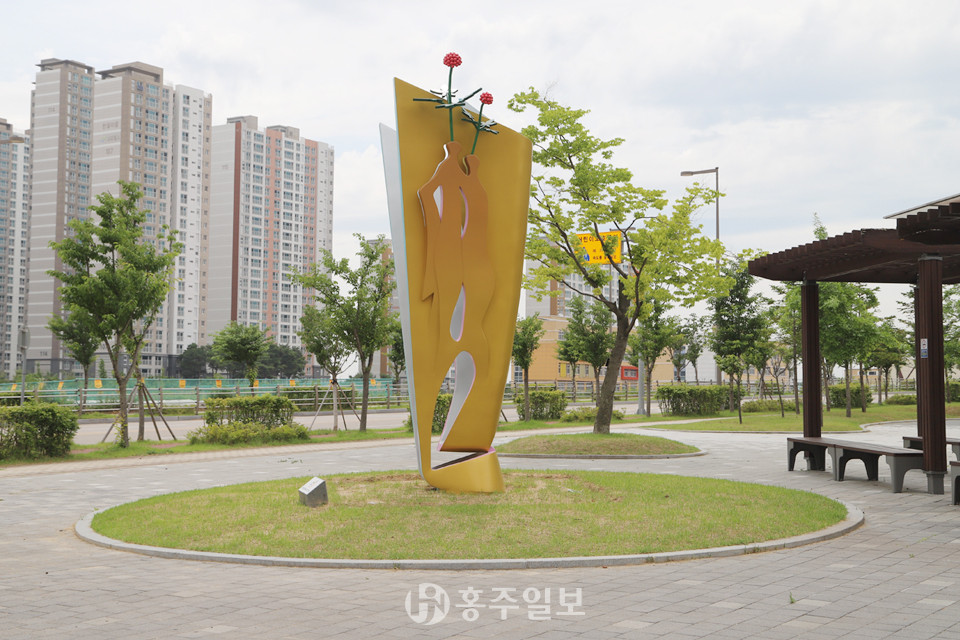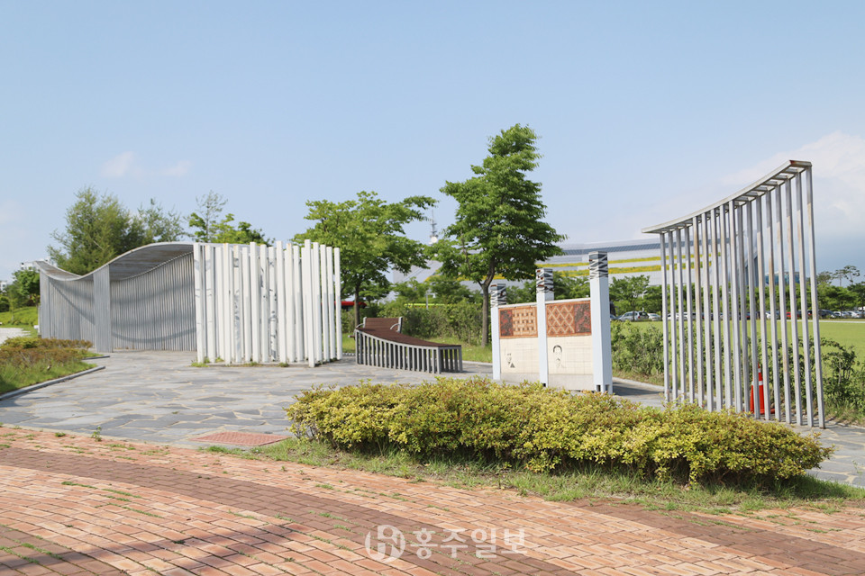 도서관사거리의 홍성테마광장에는 홍성을 상징하는 조형물이 설치돼있다. 조형물은 스틸파이프 기둥 25개에 홍성을 대표하는 역사인물 백야 김좌진 장군과 만해 한용운 선사의 얼굴을 부분별로 그려놓은 아트월과 위인들을 소개하는 비석이다. 특정 위치에서 아트월을 보면 각 위인들의 얼굴을 확인할 수 있다. 특정 위치에서만 각 얼굴을 볼 수 있어 필요한 위치를 찾는 작은 재미가 있다.