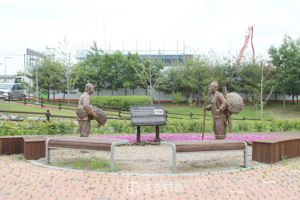 테마광장에는 형제가 밤에 서로 볏단을 나르다 마주치는 장면을 형상화한 조형물과 의좋은 형제를 설명해주는 안내문이 설치돼 있다.