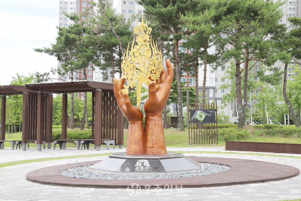 조형물은 웅진백제를 대표하는 유물인 금제관식을 공주시민들을 상징하는 두 손으로 받들어 그 소중한 가치를 영원히 기리고 미래를 위해 비상하는 공주시의 위상을 표현했다. 팔각형 모양의 기단부에는 무령왕릉에서 출토된 금제귀걸이(국보 제156호), 배게(국보 제164호), 글자가 있는 은제팔지(국보 제160호), 금제관장식(국보 제155호) 등 국보들을 새겨 백제의 찬란하고 화려했던 문화의 우수성을 나타냈다.
