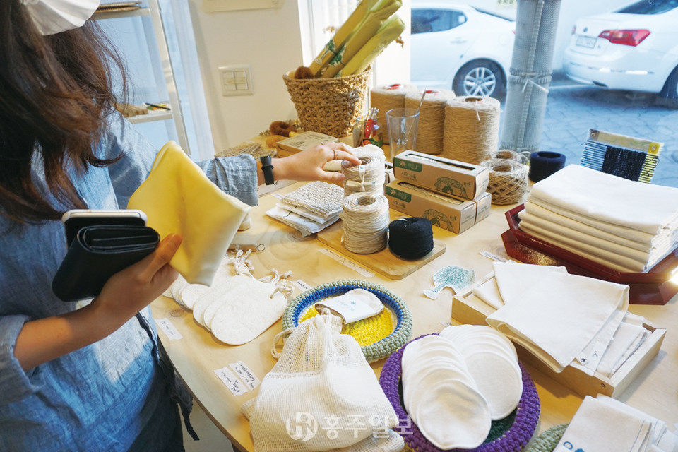 유기농 설거지 비누, 다양한 재질의 빨대, 다양한 모양과 크기의 수세미, 면 100% 행주, 천연 세제인 소프넛(비누+열매), 채소나 과일을 구매할 때 비닐봉지를 대신할 프로듀스백 등 다양한 제품이 진열돼 있다.