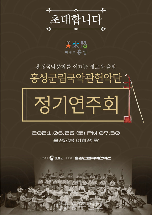 홍성군립국악관현악단(단장 길영식, 총감독 복기동, 악장 이경림)이 창립이래 오는 26일 군청 여하정 앞에서 첫 정기연주회를 개최한다.