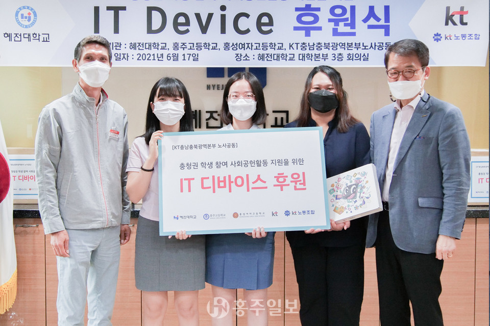 KT 충남충북광역본부 노사는 지난 17일 혜전대학교 본부 3층 회의실에서 혜전대학교(총장 이세진) 간호학과 ‘키비탄’과 ‘스마트널싱’ 봉사동아리에 IT Device(노트북 8대와 드로잉 패드 8대)를 기증했다.<사진>