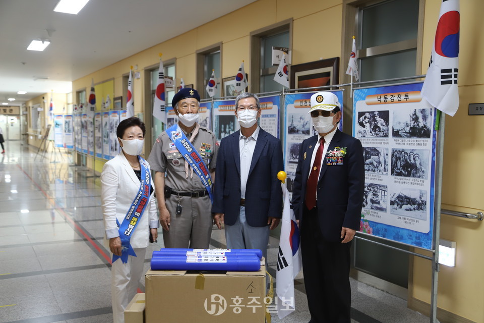 25일 홍성고에 최종수 대한민국무공수훈자회 충남지부 홍성군지회장과 보훈단체 관계자들이 방문해 이기세 교장에게 태극기 국기함 세트 50개를 전달하며 6·25 전쟁의 의미를 기렸다.