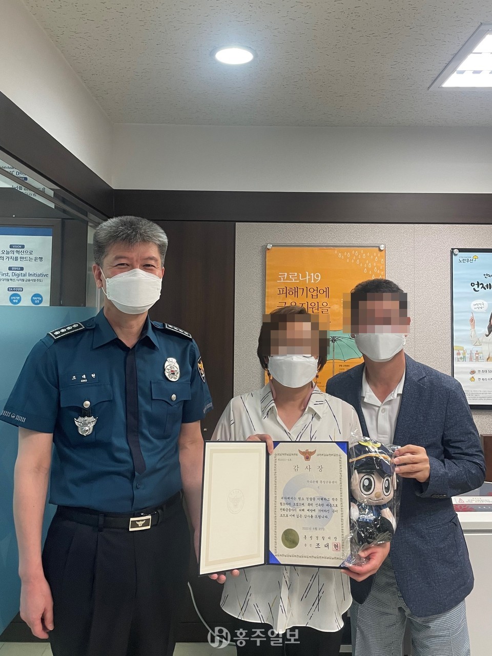 홍성경찰서(서장 조대현)는 지난 25일 우리은행 홍성금융센터를 방문해 보이스피싱 사기 피해를 예방한 직원 아무개 씨에게 감사장을 수여했다.<사진>