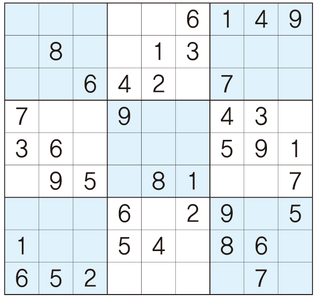 3. 큰 정사각형(9x9) 안에 있는 작은 정사각형(3x3) 안에는 숫자 1~9가 각 한 번씩 들어간다.