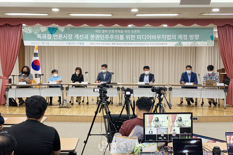 “미디어바우처, 저는 의미있는 화두를 김승원 의원님이 던졌다고 생각합니다. 하지만, 아무리 전국민에게 나눠준다고 해도 덩치나 체급 자체가 전국일간지와 지역주간지는 워낙 차이가 있기때문에 쿼터제를 둬야 한다고 생각합니다. 아예 미디어바우처 법의 실행목적을 풀뿌리민주주의를 위해 지역 공론장을 지킨다는 취지 아래 지역주간지에 쿼터를 50%정도 줘야 된다고 생각합니다.”
