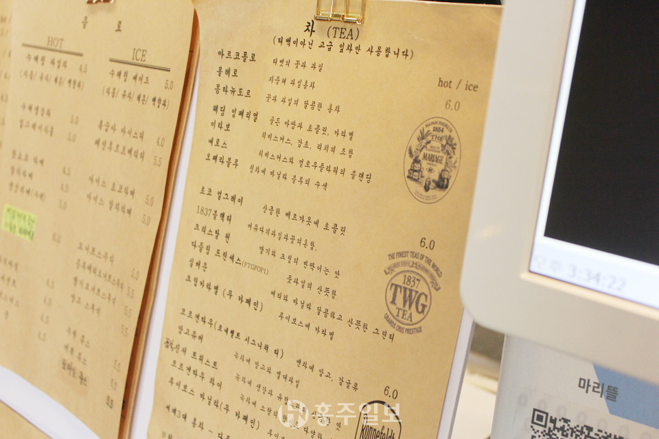 마리뜰에서는 다양한 차와 음료, 커피를 맛볼 수 있어요. 세계 3대 홍차인 다즐링, 기문, 우바부터 백차, 녹차, 홍차에 들어가는 찻잎들과 꽃잎, 그리고 과일을 섞어 만든 프랑스 브랜드 마리아즈 프레르와 싱가폴 브랜드 TWG의 블렌딩티, 직접 만든 수체청이 들어간 수제청 과일차, 생강차, 에이드, 패션후르츠베리티 등 여러 메뉴를 선보이고 있답니다. 특히 저희매장에서 주력으로 밀고 있는 건 블렌딩 메뉴들인데, 메뉴 선택 전 직접 시향도 해볼 수 있고, 마셔보면 스트레이트 홍차와는 다른 특별함을 느낄 수 있을 거예요.