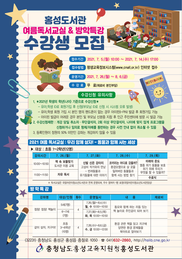 홍성교육지원청홍성도서관(관장 윤민경)은 여름방학을 맞아 유아·초등학생을 대상으로 오는 26일부터 다음달 6일까지 여름 독서 교실과 방학 특강을 운영한다.