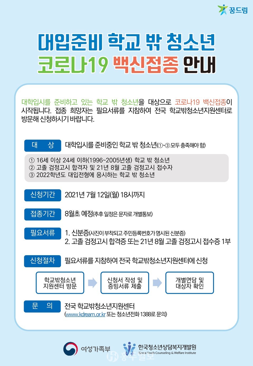 예산군학교밖청소년지원센터 꿈드림(센터장 정선경)은 2022학년도 대입을 준비하는 학교 밖 청소년을 대상으로 코로나19 백신 우선접종 접수를 진행한다.