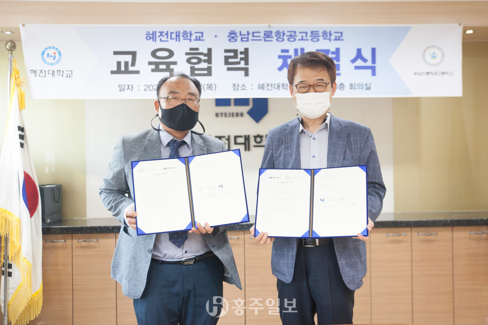혜전대학교(총장 이세진)와 충남드론항공고등학교(교장 하헌상)는 지난 8일 혜전대 회의실에서 지역 특성화 인재 양성과 직업 교육 과정(고교학점제)의 원활한 운영을 위해 교육 협력 체결식을 진행했다.<사진>