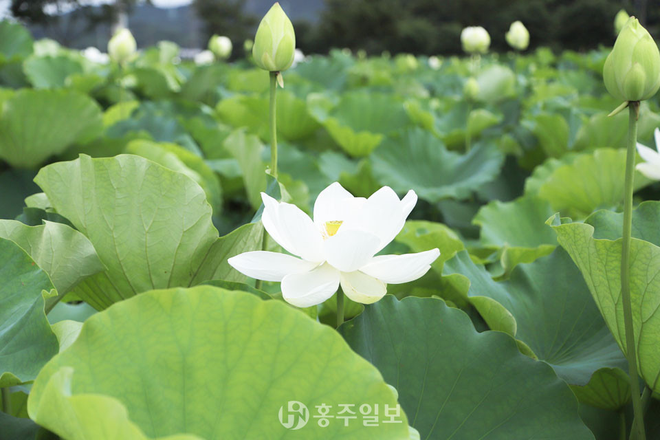 사진은 지난 13일 홍북읍 중계리에 위치한 고암 이응노 생가기념관(이응노의 집) 일원 연지공원에 만개하기 시작한 연꽃.