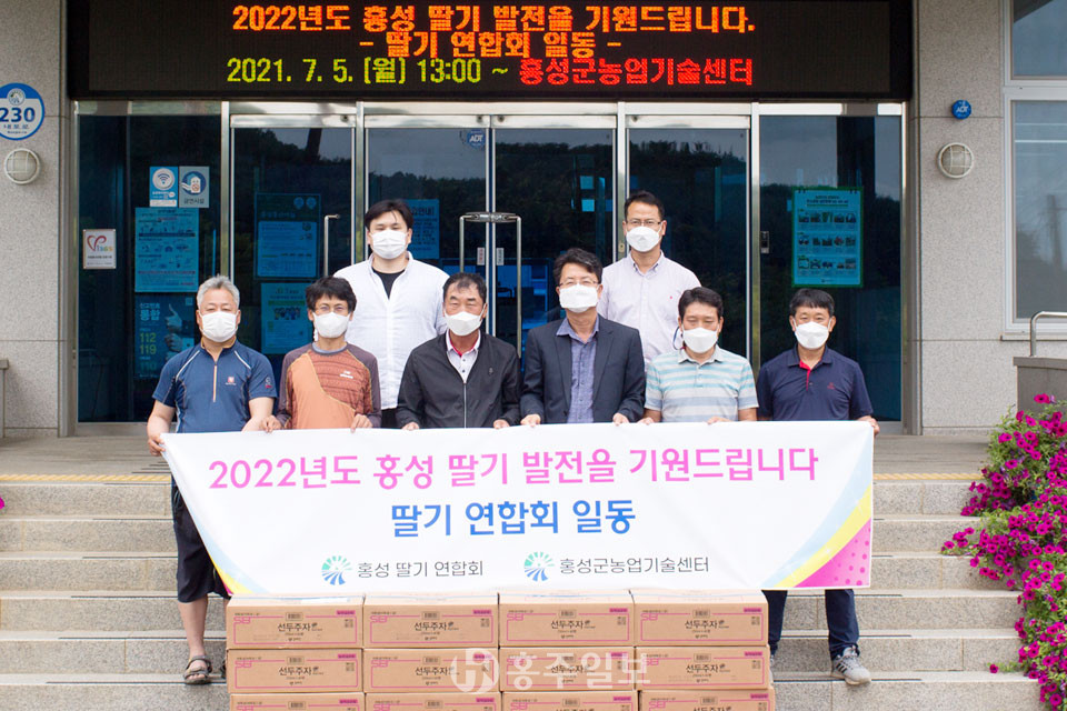 홍성군 딸기연합회(회장 홍철의·이하 연합회)가 관내 딸기재배 농가 230곳에 딸기 육묘기 방제농약을 기탁했다.<사진>