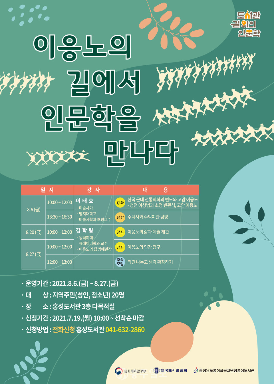 충청남도홍성교육지원청홍성도서관(관장 윤민경)이 2021년 ‘길 위의 인문학’ 공모사업에 선정돼 프로그램 ‘이응노의 길에서 인문학을 만나다’를 운영한다. 길 위의 인문학은 문화체육관광부가 주최하고 한국도서관협회가 주관하는 생활 속 인문학 구현 사업이다.