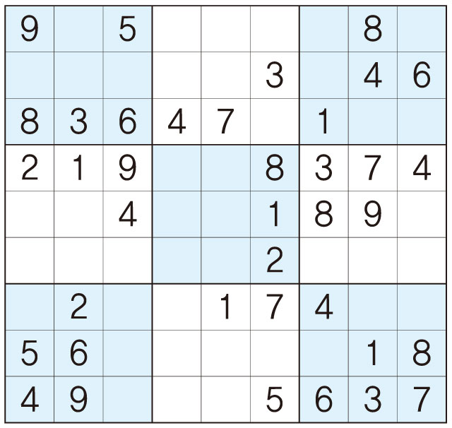 3. 큰 정사각형(9x9) 안에 있는 작은 정사각형(3x3) 안에는 숫자 1~9가 각 한 번씩 들어간다.